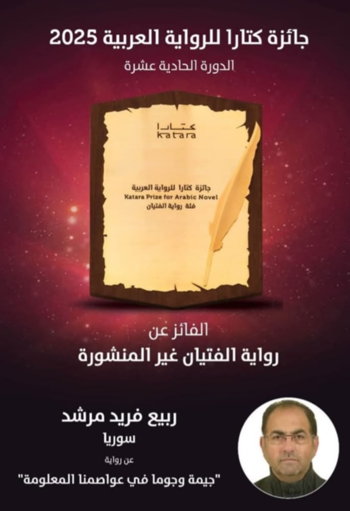 حقق الأدب السوري حضوراً متميزاً في جائزة كتارا للرواية العربية في دورتها الحادية عشرة التي تم الإعلان عنها مؤخراً في دولة قطر، من خلال فوز الروائي ربيع فريد مرشد عن فئة رواية الفتيان عبر روايته "جيمة وجوما في عواصفنا المعلومة". وتعد جائزة كتارا للرواية العربية من أهم الجوائز الأدبية العربية، وحول هذه الجائزة كان حوارنا التالي مع ربيع مرشد الذي أكد في حواره على أن فوزه كان قائماً على عدة أمور: "الفكرة الجديدة، مناقشة مسائل تخص جيل الفتيان، تقديم النص بطريقة مناسبة لهذه الفئة العمرية".